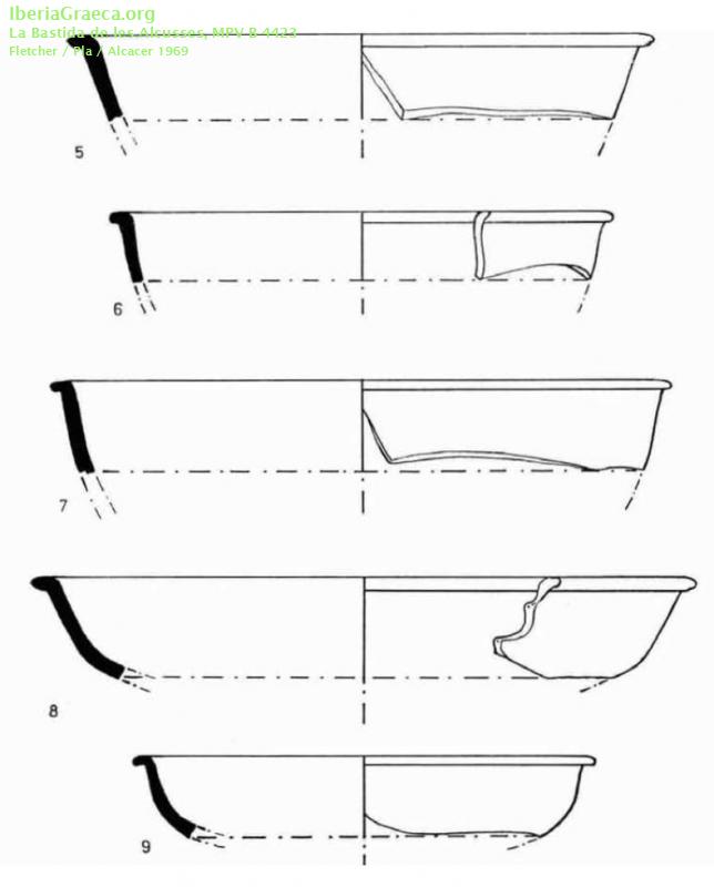 Observaciones : 5 fragmentos de diferentes piezas. Fig. 5: B-4423 Fig. 6: B-4468 Fig. 7: B-4488 Fig. 8: B-4427 Fig. 9: B-4436. Además de estos ejemplares aparece, según FLETCHER/PLA/ALCACER 1969, p. 265: "Dos fragmentos de borde de sendas páteras áticas de barniz negro brillante, de muy buena calidad, y pasta rojiza. Forma 22. (no se dibujan.) Inventario B-4.457 y 4.464" y "Fragmento de borde de pátera ática de barniz negro muy brillante y pasta grisácea amarillenta. Al parecer de la forma 22. (No se dibuja.) Inventario B-4.460". Autor: Alejandra Macián (Universitat de València-EG) Supervisor: José Pérez Ballester (Universitat de València-EG) Fecha: 09-11-2018 |