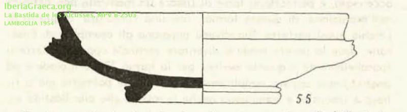 Origen : Ática Técnica : C. de barniz negro Forma : Copa Cástulo Tipo : Lamb. 42 A Parte Conservada : Borde, pared y pie DECORACIÓN