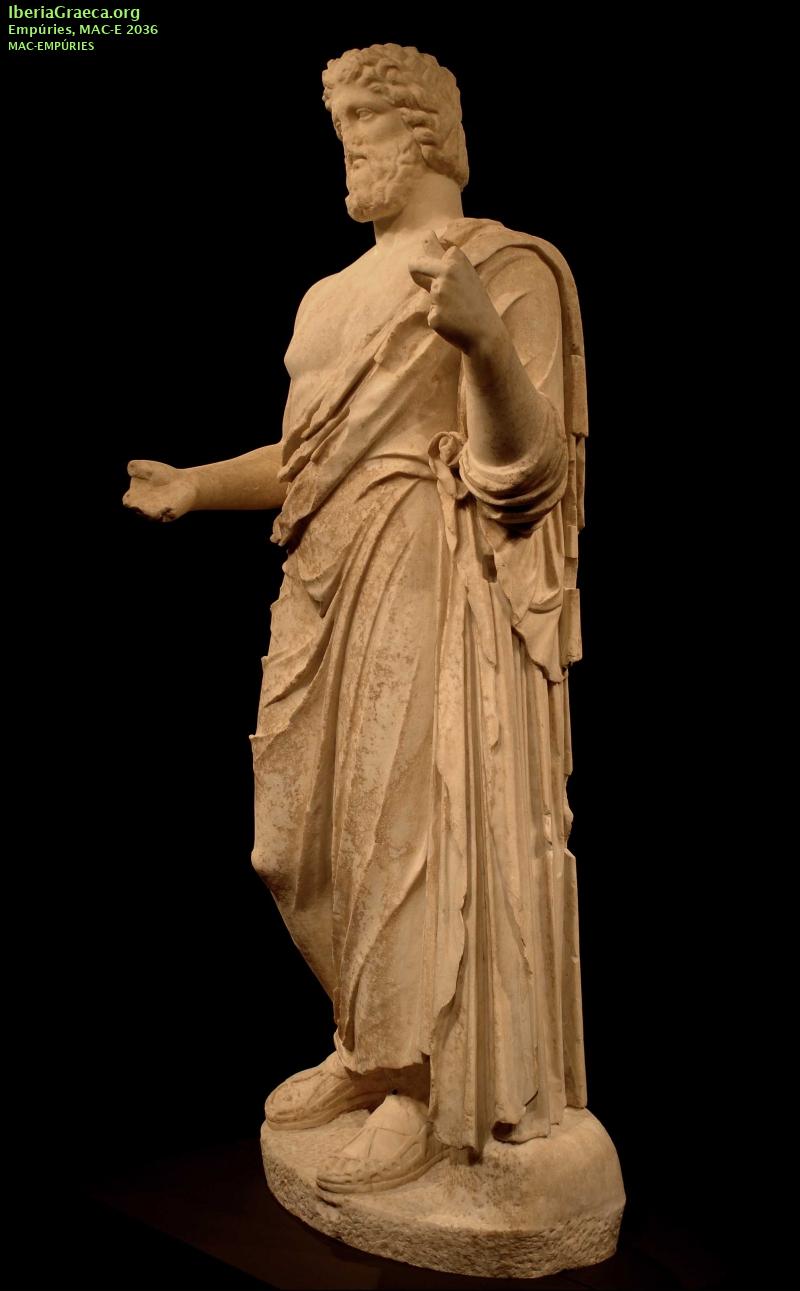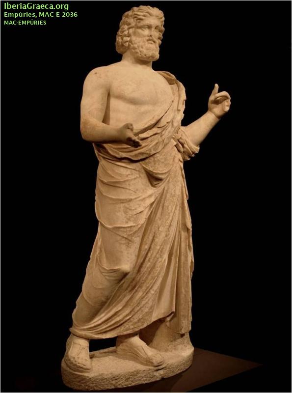 Descripcion : Estatua de 2,20 m de altura formada por dos fragmentos de mármol que encajan en el torso. La parte inferior del cuerpo, vestida con himation y sandalias, está realizada con mármol del Pentélico. La parte superior, con busto desnudo, cabeza barbada con cabellos recogidos con una cinta y brazos, esta efectuada con mármol de Paros. Restos de la policromía muy perdidos. Observaciones : Hallada en el año 1909 en la zona de los santuarios del sector meridional de la Neápolis. Algunos autores identifican la estatua con un Agathos Daimon, un Serapis o una estatua sincrética de Zeus/Asclepios/Serapis. Autor: Xavier Font (CIG) Supervisor: Xavier Aquilué (CIG) Fecha: 20-10-2020 |