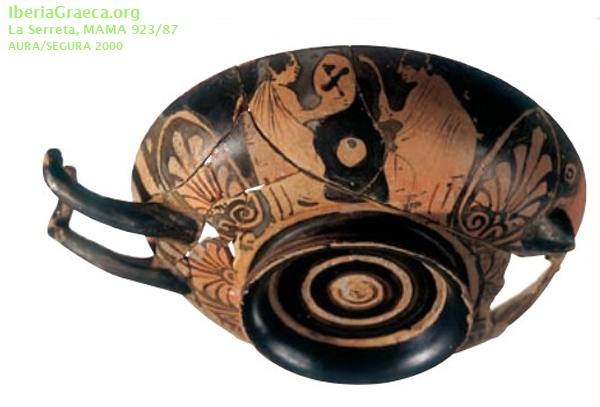 Uso secundario : Ajuar funerario Observaciones : El medallón central presenta un joven atleta envuelto en su himation, que lleva en la mano derecha un disco, en actitud oferente ante un altar. En el exterior, dos grupos de dos jóvenes enfrentados. Uno de ellos con un disco y los dos restantes con una estrígile en una de las caras, entre los dos jóvenes se ha representado un aríbalo. Autor: Beatriz Domingo (CIG) Supervisor: Margarita Moreno (CIG) Fecha: 21-10-2020 |