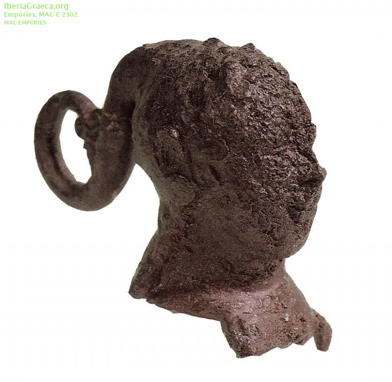 Descripcion : Fragmento de una figura de bronce, tradicionalmente identificada como una sirena, de la cual se ha conservado la cabeza de 8,9 cm de altura, 10,4 cm de largo y 5,4 cm de ancho. Luce peinado recogido con una coleta vuelta en espiral decorada con una palmeta arcaica en el extremo. Como ormanento personal lleva pendientes de disco doble con botón central. Observaciones : Hallada en 1929 en la zona de la necrópòlis de Les Corts sin supervisión arqueológica. Inicialmente M. Almagro (1953) la adscribió al ajuar funerario de la tumba 67, como parte de un lampadario, asociada a una pata con tres garras y una pequeña mano también de bronce. En la actualidad, se interpreta como un aplique decorativo de un vaso de bronce de estilo orientalizante. Autor: Xavier Font (CIG) Supervisor: Xavier Aquilué (CIG) Fecha: 25-10-2020 |