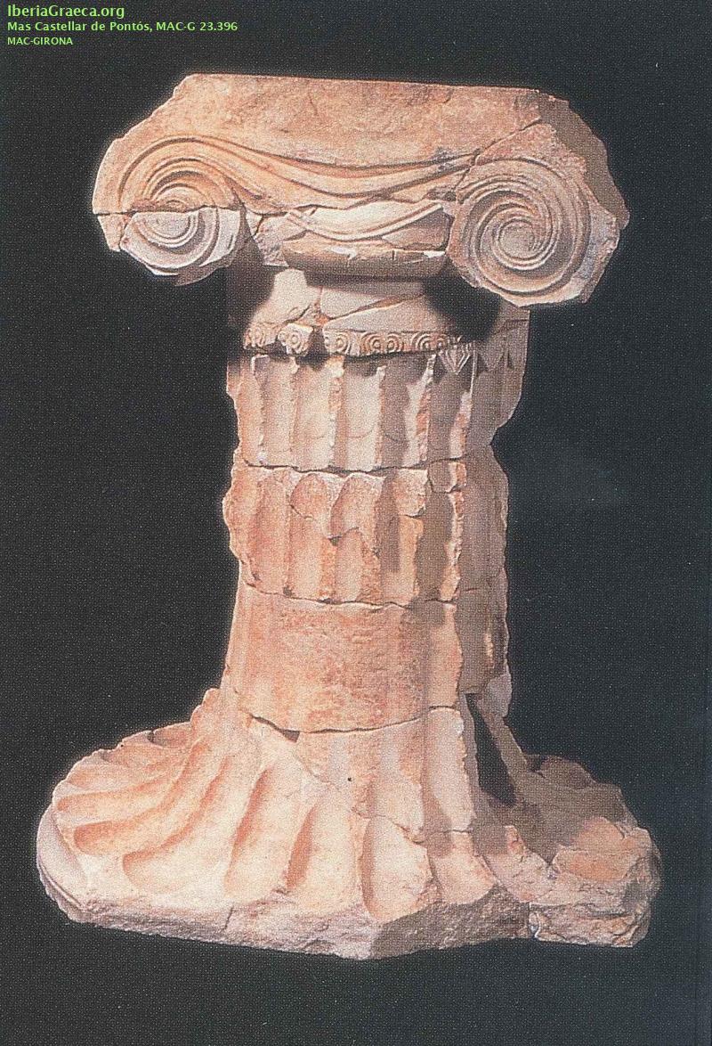 Descripcion : Ara monolítica esculpida en mármol del Pentélico con forma de columna con capitel jónico. Presenta 62 cm de altura total con un diámetro de 22-25 cm en el fuste. Muestra un encaje cuadrangular de 11,5 cm de lado por 4 cm de profundidad en la parte superior. Observaciones : Hallada en una habitación de la casa porticada del poblado. Su uso ritual ha sido objeto de diferentes interpretaciones. Autor: Xavier Font (CIG) Supervisor: Xavier Aquilué (CIG) Fecha: 25-10-2020 |