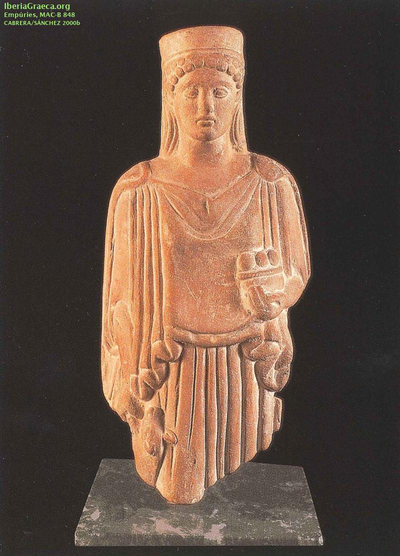 Descripcion : Figura de terracota de 16,2 cm de altura y 7,6 cm de anchura. Representa a una mujer oferente que viste un peplo. La cabeza cubierta con un gorro tipo polos permite observar el peinado lacio en los laterales y rizado en la frente. Con la mano derecha sujeta un lechón a lo largo del cuerpo, mientras que en la mano izquierda lleva un pequeño recipiente con fruta o con huevos, situado frontalmente cerca del pecho, con el brazo flexionado. Estas representaciones de ofrendas a las divinidades se interpretan como pertenecientes a las celebraciones de las fiestas eleusinas. Observaciones : Hallada alrededor del año 1900 durante los trabajos de fijación de las dunas de la costa en la zona de la cella memoriae de la Neápolis. Autor: Xavier Font (CIG) Supervisor: Xavier Aquilué (CIG) Fecha: 26-10-2020 |