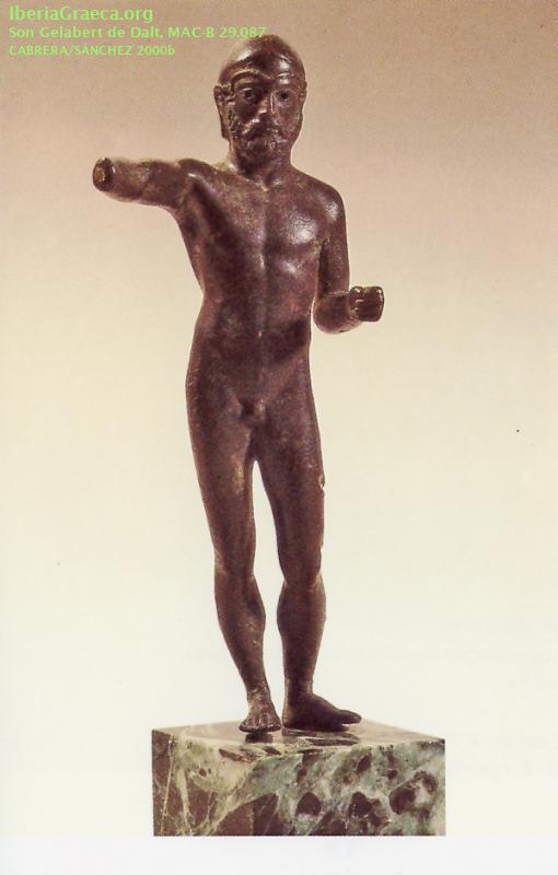 Descripcion : Figura exenta de bronce, de 21 cm de altura. Representa un personaje masculino desnudo, identificado como un guerrero, barbado y con casco de tipo calcídico sin protección de las mejillas. Presenta el brazo derecho elevado en horizontal, al cual le falta la mano, mientras que el brazo izquierdo flexionado en ángulo recto con la mano avanzada, podría sostener una lanza en posición vertical de descanso. Se plantea como hipótesis que llevara un escudo en la mano derecha. Observaciones : La figura fue hallada en 1867 durante los trabajos de instalación de un vértice geodésico, pasando a formar parte de la colección Planes y Ferré de Palma de Mallorca. Posteriormente fue adquirida por Damià Mateu, quien en 1935 la cedió al Museo Arqueológico de Barcelona (MAC-Barcelona). Autor: Xavier Font (CIG) Supervisor: Xavier Aquilué (CIG) Fecha: 02-11-2020 |