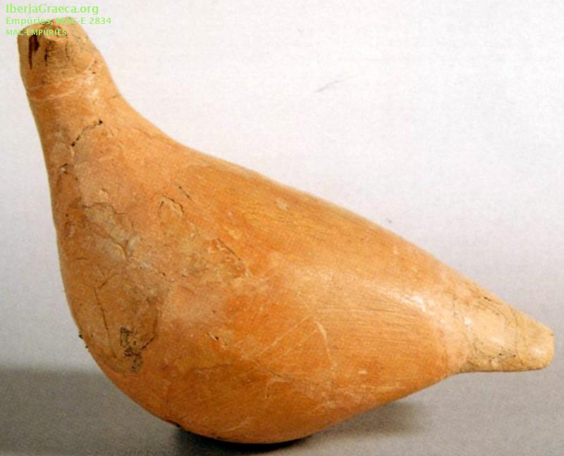 Uso secundario : Ajuar funerario Descripcion : Terracota con forma de una paloma de 5,6 cm de altura, 10,7 cm de longitud y 4,7 cm de ancho, que presenta la cabeza inclinada hacia la izquierda. No se han conservado restos de policromía. Observaciones : Restaurada con restituciones de yeso. El ajuar de esta tumba estaba formado por 3 escifos (CIG 3910, 3924 y 4901), 4 oinochoes (CIG 3920, 3921, 3922 y 3923), 2 ánforas (CIG 3918 y 3919), 1 copa (CIG 3917) de cerámica griega, esta paloma de terracota, 1 anillo de oro (CIG 11448) y 1 alabastron de pasta de vidrio. Autor: Xavier Font (CIG) Supervisor: Xavier Aquilué (CIG) Fecha: 03-11-2020 |