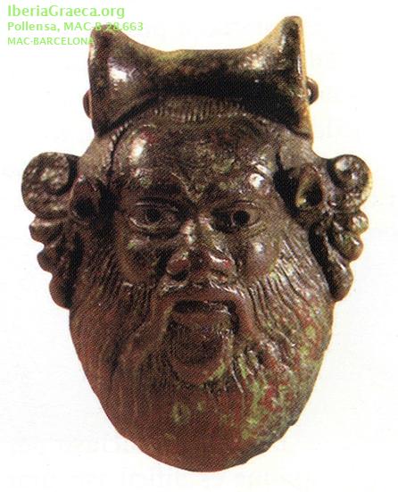 Descripcion : Pequeña cabeza de bronce de 4,5 cm de altura por 3,5 cm de anchura máxima. Representa un sileno o sátiro con marcada expresión de las características faciales: barba, bigote y cabello, con orejas puntiagudas acompañadas por sendas volutas y palmetas en los laterales. Las pupilas de los ojos en vacío. La parte superior de la cabeza muestra un cilindro convexo dispuesto horizontalmente, con orificios y engarces, que permitirían ser colgada. La técnica empleada para los trazos faciales responde al uso de buriles e incisiones. Observaciones : Se interpreta como un posible aplique decorativo de bronce de un objeto sin definir (recipiente de bronce, mobiliario,...) Autor: Xavier Font (CIG) Supervisor: Xavier Aquilué (CIG) Fecha: 05-11-2020 |