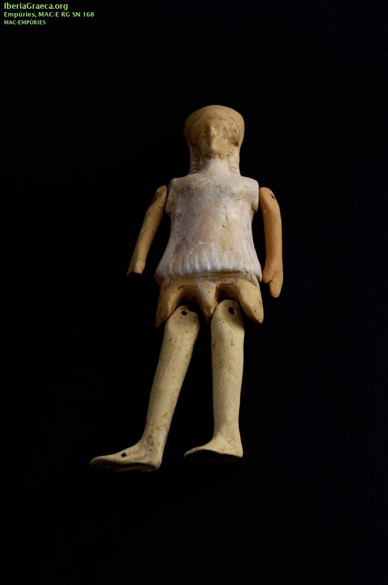 Descripcion : Muñeca articulada de terracota de una figura femenina joven. Mide 12,9 cm de altura por 3,76 cm de anchura máxima. Compuesta por cinco piezas, cuerpo con la cabeza, brazos y piernas por separado. El movimiento articular se realiza mediante la unión a través de unas pequeñas perforaciones en la parte superior de las extremidades. Lleva un vestido corto, sencillo, que conserva restos de pintura blanca, a su vez la cabeza está cubierta con un gorro tipo polos, con pigmentos de color rojo. Del peinado destacan las dos trenzas, una a cada lado de la cabeza. Observaciones : Hallada el 26 de octubre de 2010 en la excavación de la necrópolis situada al sur de la Neápolis, con motivo de la construcción del Centro de Recepción de Visitantes de Empúries. Formaba parte del ajuar funerario de una inhumación infantil junto con otra terracota que representa un panadero (CIG 11462 ) y una jarra de cerámica decorada con bandas pintadas en rojo. Autor: Xavier Font (CIG) Supervisor: Xavier Aquilué (CIG) Fecha: 06-11-2020 |