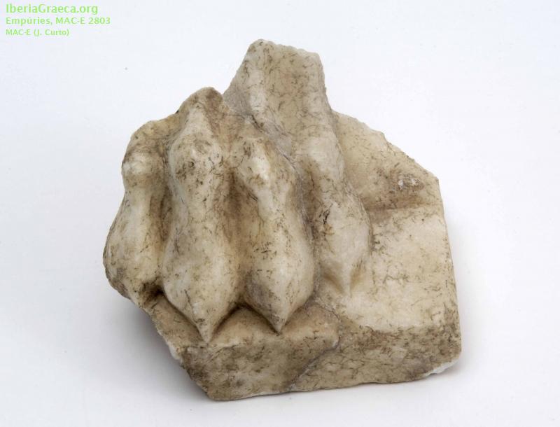 Descripcion : Fragmento esculpido en mármol de una garra de un animal sin determinar (un felino o un cánido). Corresponde a la pata izquierda delantera que reposa en el ángulo anterior izquierdo de una base rectangular. Se dan diferentes interpretaciones sobre su atribución: Sanmartí 1992 apunta la posibilidad que el fragmento pertenezca a un Cerbero, mientras Ruiz de Arbulo y Vivó 2007 no descartan que se trate de una esfinge, o que formara parte de la ornamentación de una pieza mobiliaria marmórea. Observaciones : Fragmento hallado durante las excavaciones de 1909 en el interior del templo M en la zona meridional de la Neápolis, junto con la parte inferior y brazos de la escultura de Asklepios (CIG 11213), el ara (CIG 11503), la cabeza y las piernas de Apolo Liceo (CIG 11362), la placa con la Esfinge (CIG 11504), los pies marmóreos con sandalias (CIG 11505), la cornucopia (CIG 11507) y la serpiente (CIG 11508). Autor: Xavier Font (CIG) Supervisor: Xavier Aquilué (CIG) Fecha: 10-11-2020 |