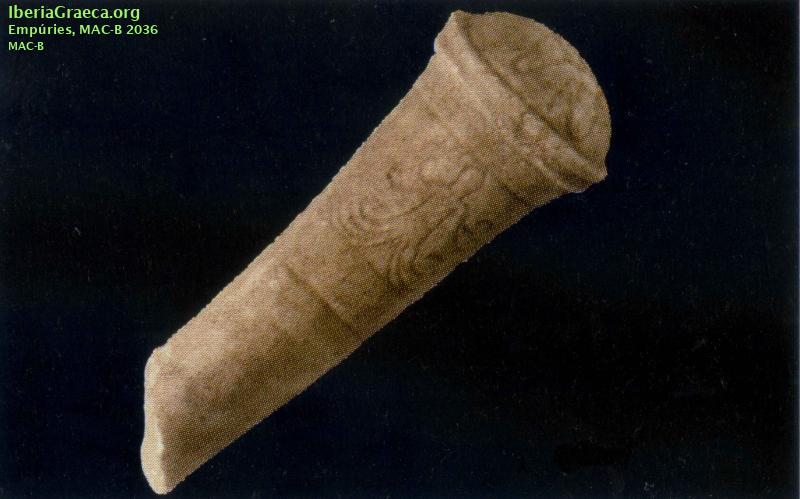 Descripcion : Fragmento del extremo superior de una cornucopia del tipo omphalos, con panecillo redondo, labrada en mármol pentélico. La superficie exterior presenta como decoración una figura humana de carácter esquemático, con trazos serpentiformes y una hoja compuesta. Inicialmente Almagro y Kukhan 1958 la interpretaron como extremo del báculo de la escultura de Asklepios, sin embargo Schröeder 1996 lo identifica como el extremo de una cornucopia. Más recientemente Ruíz de Arbulo y Vivó 2007 apuntan la posibilidad de que esta cornucopia formara parte de los elementos que complementarían la escultura del Apolo Liceo (CIG 11362). Observaciones : Este fragmento fue hallado durante las excavaciones de 1909, en la misma zona del templo M donde se localizó la parte inferior y brazos de la escultura de Asklepios (CIG 11213), el ara (CIG 11503) la cabeza y las piernas de Apolo Liceo (CIG 11362), la placa con la Esfinge (CIG 11504), la serpiente (CIG 11508 ) y la garra animal de mármol (CIG 11506). Autor: Xavier Font (CIG) Supervisor: Xavier Aquilué (CIG) Fecha: 10-11-2020 |