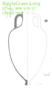 Origen : Panticapaion Forma : Ánfora de transporte Tipo : Tipo O de El Sec Parte Conservada : Perfil completo DECORACIÓN Observaciones : Según Cerdà 1987b, hay 38 ejemplares de esta forma cuyo centro de producción sería Panticapaion, en el Mar Negro, con dos ejemplares enteros, de los que se representa el dibujo de uno de ellos. Autor: Sara Martínez (CIG) Supervisor: Xavier Aquilué (CIG) Fecha: 04-02-2021 |