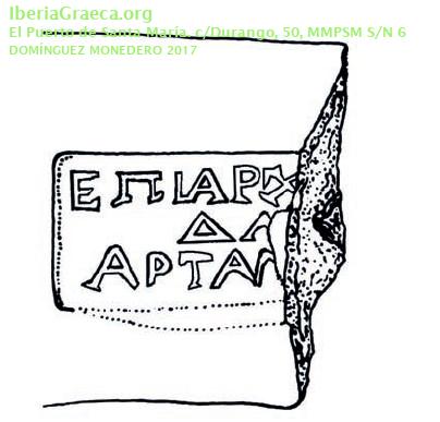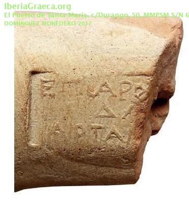 Observaciones : Cartela rectangular fragmentada. Su transcripción permite afirmar que fue estampada durante la magistratura de Arquilaidas, sacerdote también del culto a Helios, datada entre el 165 y el 163 a. C., en el mes de Artamitio (abril/mayo). Apareció en una excavación del año 1987 junto con un importante conjunto cerámico de la primera mitad del siglo II a. C. Autor: Sara Martínez (CIG) Supervisor: Xavier Aquilué (CIG) Fecha: 09-03-2021 |