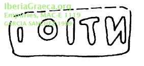 Observaciones : Sello, truncado por la parte superior, situado en una asa de la ánfora, una posible grecoitálica o Dressel l, inscrito en el interior de una cartela cuadrangular. La lectura es incierta e incluso, como propuso en su día Martín Almagro, podría tratarse de un sello en alfabeto latino y no griego. Autor: Conxita Ferrer (CIG) Supervisor: Xavier Aquilué (CIG) Fecha: 10-08-2023 |