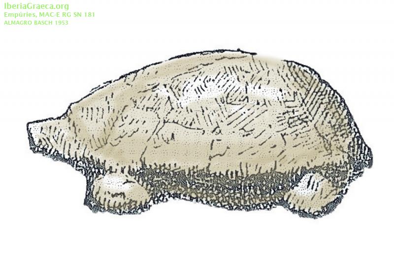 Descripcion : Pequeña figura de terracota realizada a molde, con arcilla depurada, representando una tortuga. De manufactura simple muestra escasos detalles anatómicos, destacando el caparazón y los cuatro pies. Las dimensiones son 35 mm de altura por 65 mm de largo. Observaciones : Hallada en la inhumación número 43 de la Necrópolis Bonjoan junto con dos figuras más de terracota, otra tortuga (CIG 12386) y un jabalí (CIG 12387). Destaca del resto del ajuar funerario cinco lecitos áticos de figuras negras atribuibles al pintor de Haimon (480-470 aC) (CIG 4526, 4530,4657,4662, 4663). Su procedencia atribuida a talleres magno-griegos no es segura. Autor: Xavier Font (CIG) Supervisor: Xavier Aquilué (CIG) Fecha: 10-12-2023 |