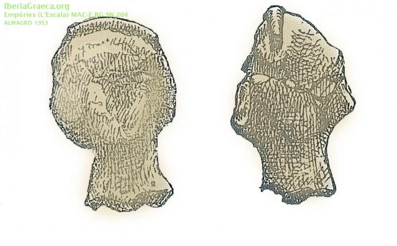Descripcion : Cabeza de terracota perteneciente a una figura femenina incompleta. No se definen los rasgos faciales a causa del deterioro. Se observa el cabello recogido en la parte posterior con gorro algo desfigurado. El gesto se muestra con una ligera inclinación de la cabeza hacia la derecha. Mide 50 mm de altura. Observaciones : Terracota depositada como ajuar funerario en la incineración número 104 de la necrópolis de Les Corts. Señalar la presencia de otras dos figuras también de terracota, muy parecidas a esta, (CIG 12487, 12488) prácticamente idénticas. Su procedencia atribuida a talleres magno-griegos no es segura. Autor: Xavier Font (CIG) Supervisor: Xavier Aquilué (CIG) Fecha: 15-12-2023 |