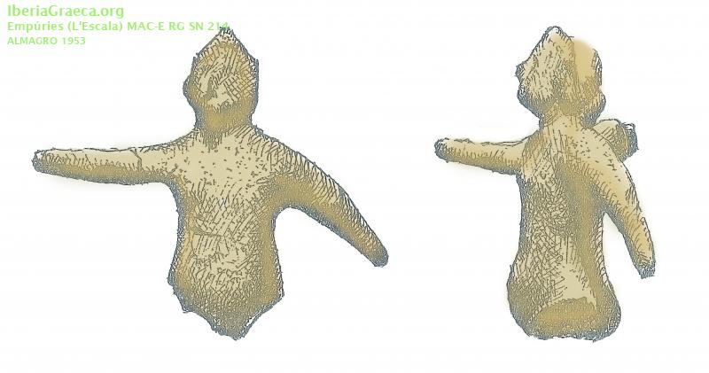 Descripcion : Figura de terracota incompleta, representa a Eros con los brazos en movimiento, extendidos a media altura. Le faltan las manos y las piernas. La longitud conservada es de 70 mm. Observaciones : Terracota depositada como ajuar funerario en la incineración número 140 de la necrópolis de Les Corts. Su procedencia atribuida a talleres magno-griegos no es segura. Autor: Xavier Font (CIG) Supervisor: Xavier Aquilué (CIG) Fecha: 16-12-2023 |