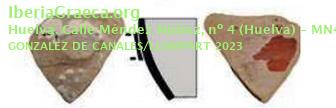 Observaciones : En el exterior conserva restos de engobe blanco, en el interior sobre engobe blanco, restos de engobe rojo amarillento. Arcilla rosa con aisladas inclusiones de calcita y mica plateada. Autor: Immaculada Mesas (CIG) Supervisor: Xavier Aquilué (CIG) Fecha: 19-12-2023 |