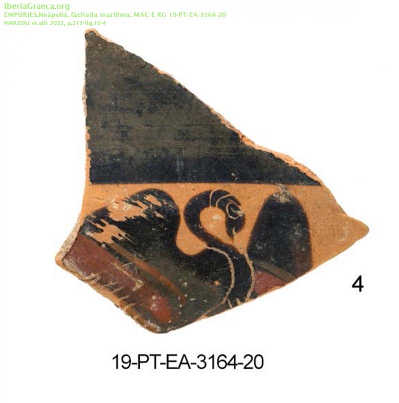 Observaciones : Fragmento de copa ática de bandas, relacionada con producciones de figuras negras de los pequeños maestros. Presenta decoración zoomorfa, los trazos del plumaje del cisne están realizados con pequeñas incisiones. Hallado en los niveles de la fase 1A de la fachada marítima (sector playa del Moll Grec) de la Neápolis de Empúries. Autor: Xavier Font (CIG) Supervisor: Xavier Aquilué (CIG) Fecha: 26-02-2024 |