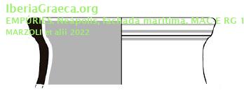 Observaciones : Borde de olpe, de pasta clara de origen massaliota, de cuello casi cilíndrico, con pequeño reborde moldurado, de la forma Bats 527c. Hallado en los niveles de la fase 2B de la fachada marítima (sector playa del Moll Grec) de la Neápolis de Empúries. Autor: Conxita Ferrer (CIG) Supervisor: Xavier Aquilué (CIG) Fecha: 07-08-2024 |
