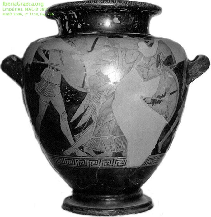 | Tipo Decoración : Pintada, Barnizada Escena : Guerra de Troya, Mitológica Personajes : Aquiles, Héctor, Atenea, Apolo, Dioniso, Hermes, Zeus, Hera Elementos Secundarios : Coraza, Casco, Escudo, Lanza, Corona de laurel, Clámide, Arco, Tirso, Pétasos, Cetro, Cnémides, Quitón, Himation Motivos Ornamentales : Banda de ovas, Lengüetas, Greca de meandros