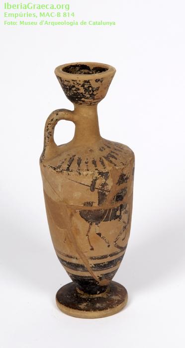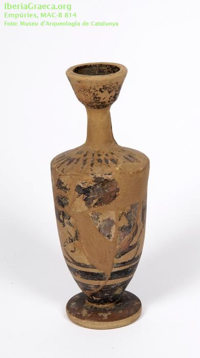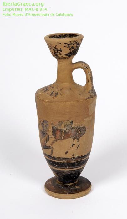 Uso secundario : Ajuar funerario Observaciones : Restaurado. Decoración parcialmente perdida. El ajuar de esta tumba estaba formado por cinco lecitos áticos de figuras negras (CIG 174, 198, 241, 816 Y 4533), dos jarritas de cerámica con pintura roja de tipo "jonio", un vaso de cerámica gris emporitana, una anforita de pasta de vidrio, una fíbula de bronce y un anillo de plata. Autor: Marta Santos (MAC-Empúries) Supervisor: Xavier Aquilué (CIG) Fecha: 16-10-2008 |
