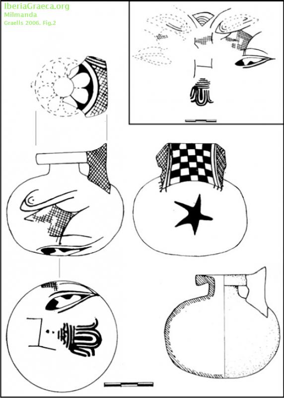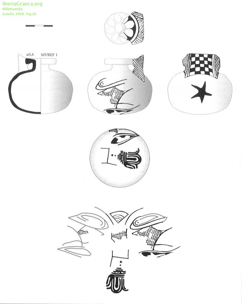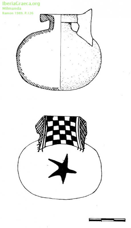 Uso secundario : Ajuar funerario Observaciones : Se compara con otros aryballoi del S.VI a.C encontrados en Catalunya. ¿engobe o base de pintura blanca?. Decoración: pintura negra sobre el fondo blanco, consiste en una retícula ajedrezada en el asa, ovas en el fondo, roseta de ocho pétalos en la parte superior del disco, y, en la pared del cuerpo una estrella de cinco puntas y un cuadrifólio. Ajedrezado del asa, algunos motivos florales del cuerpo, la estrella y los laterales del disco. Flor de loto cuadrifolia. Domínguez, Sánchez 2001 y Ramón 1995 comentan que es del tipo A de Payne Autor: Faustino Pérez Moracho (ICAC) Supervisor: M. T. Miró (Generalitat de Catalunya) Fecha: 28-10-2011 |