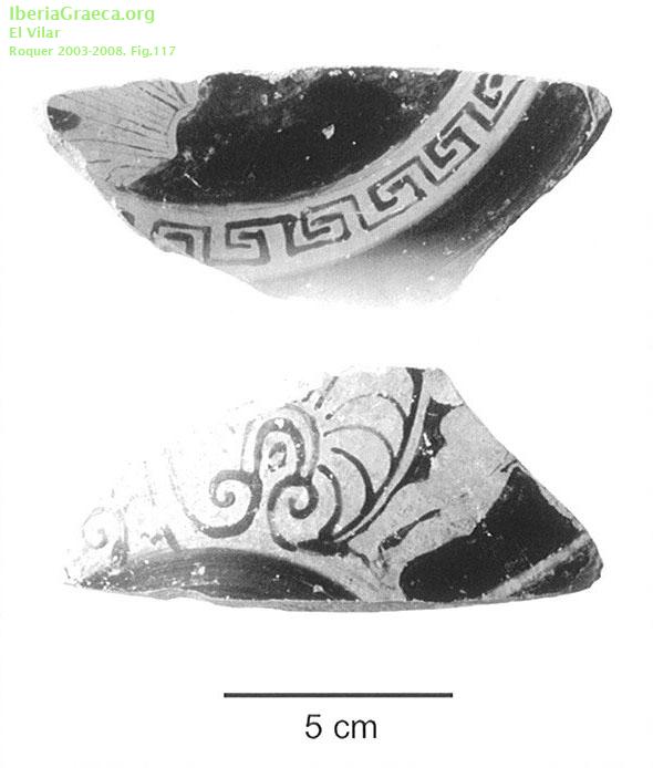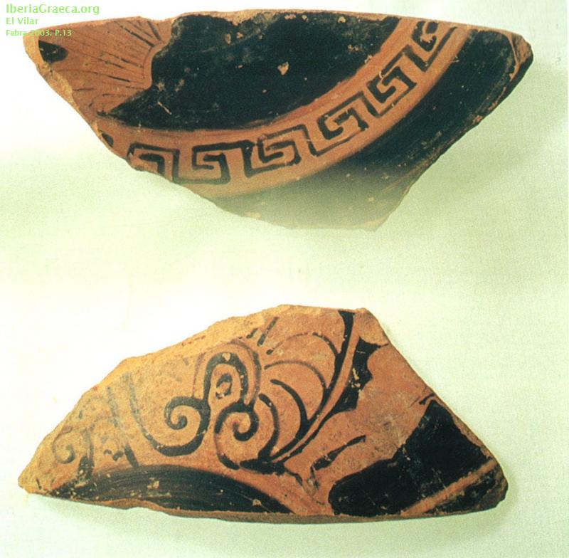 Observaciones : Medidas: 5,2 x 12 x 1 cms. Pasta de buena calidad, muy fina y de tonos rosados. Pigmento negro,excelente, poco intenso aplicado en una finísima capa que deja entrever el color de la arcilla. Interior: dibujo geométrico pintado a base de grecas que rodea una escena indescifrable. Exterior: motivos florales al lado de una figura masculina desnuda de la que se conserva la parte inferior. DM: 120mm Autor: Faustino Pérez Moracho (ICAC) Supervisor: M. T. Miró (Generalitat de Catalunya) Fecha: 11-11-2011 |