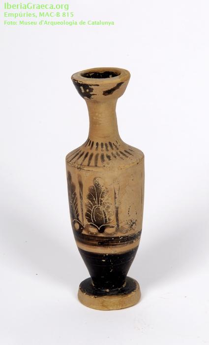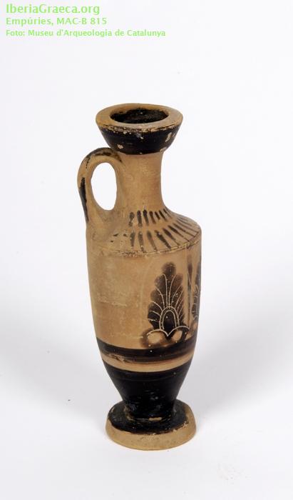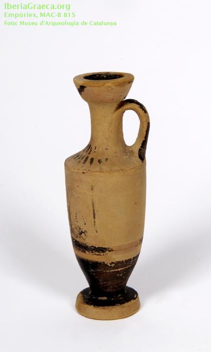 Uso secundario : Ajuar funerario Observaciones : El ajuar de esta tumba estaba formado por cinco lecitos áticos de figuras negras (CIG 174, 198, 241, 816 Y 4533), dos jarritas de cerámica con pintura roja de tipo "jonio", un vaso de cerámica gris emporitana, una anforita de pasta de vidrio, una fíbula de bronce y un anillo de plata. Autor: Marta Santos (MAC-Empúries) Supervisor: Xavier Aquilué (CIG) Fecha: 07-11-2008 |
