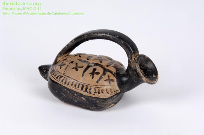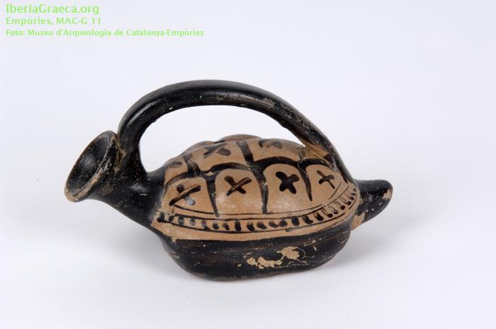 Origen : Griega indeterminada Técnica : C. de barniz negro Forma : Ascos plástico Tipo : Askos en forma de tortuga Parte Conservada : Perfil completo DECORACIÓN