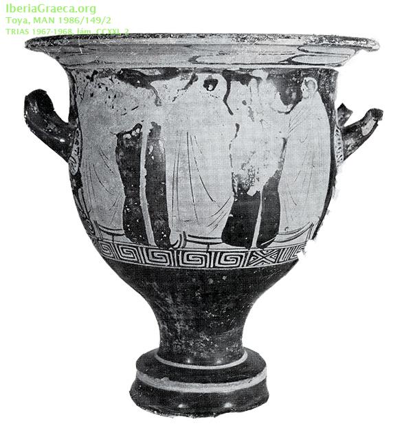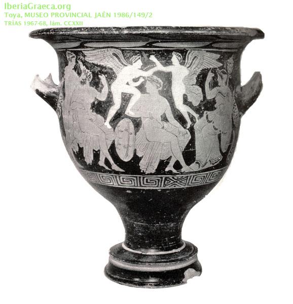Origen : Ática Técnica : C. de figuras rojas Forma : Cratera de campana Parte Conservada : Perfil completo Autor/Taller : TOYA P DECORACIÓN