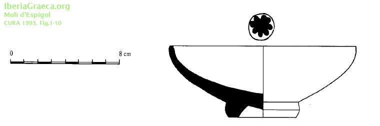 Origen : Rhode Técnica : C. de barniz negro Forma : Cuenco Tipo : Lamboglia 27 Parte Conservada : Perfil completo DECORACIÓN