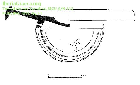 Observaciones : Grafito de esvástica incisa en el el fondo externo después de la cocción. Pendiente el número de inventario del Museu Comarcal de l´Urgell. Autor: Faustino Pérez Moracho (ICAC) Supervisor: M. T. Miró (Generalitat de Catalunya) Fecha: 15-01-2013 |