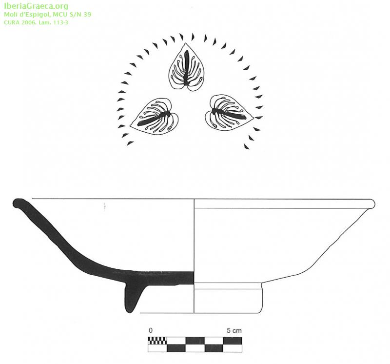 Origen : Rhode Técnica : C. de barniz negro Forma : Copa Tipo : Lamboglia 28/ Morel 2642 Parte Conservada : Perfil completo DECORACIÓN