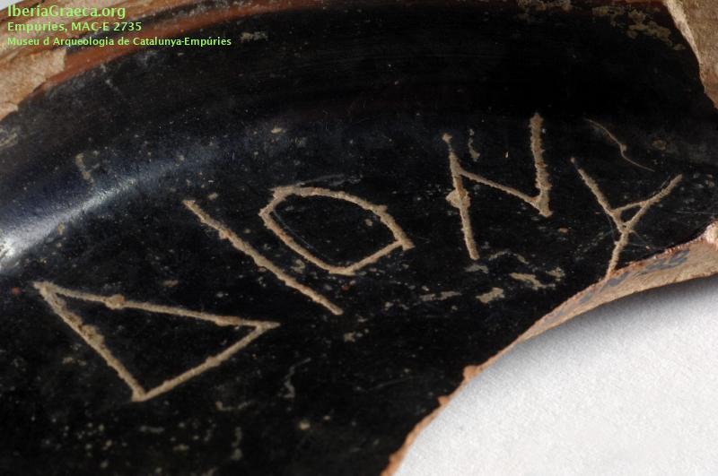 Observaciones : Campaña de Excavación 1988, sector Sur. Apareció en un contexto del siglo III aC. Según DE HOZ GARCÍA BELLIDO 2014, inscripción de posible indicación de uso cultual: ΔΙΟΝΥ= de Dionysos. Autor: Sara Martínez (CIG) Supervisor: Xavier Aquilué (CIG) Fecha: 21-06-2013 |