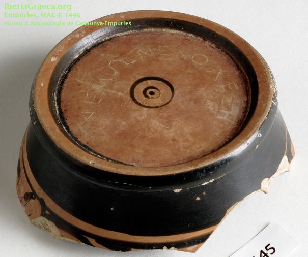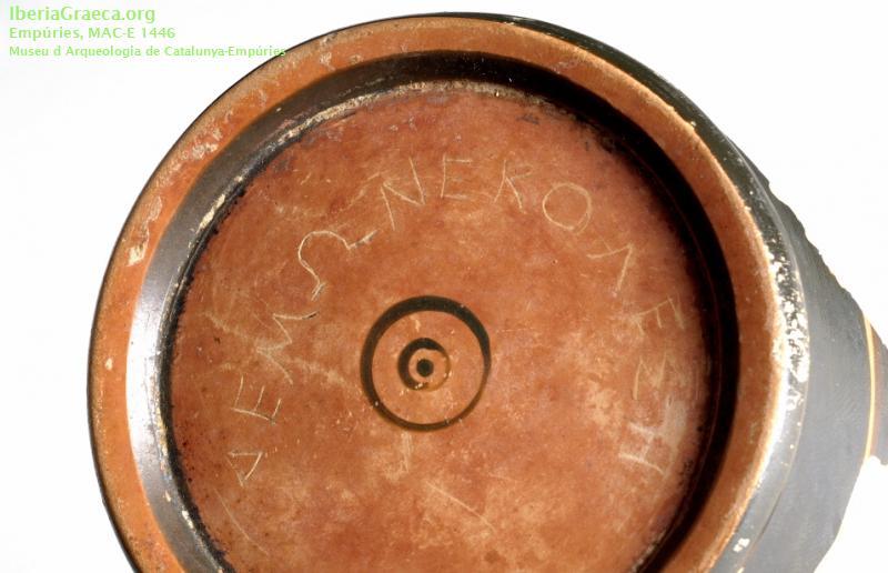 Observaciones : 12 letras griegas de 5mm. Según DE HOZ GARCIA-BELLIDO 2014 se lee: ΔEMΩN EKOΛEΣH = Demón lo pegó. Posible alusión del grafito a un personaje que repararía el vaso. Autor: Sara Martínez (CIG) Supervisor: Xavier Aquilué (CIG) Fecha: 21-06-2013 |
