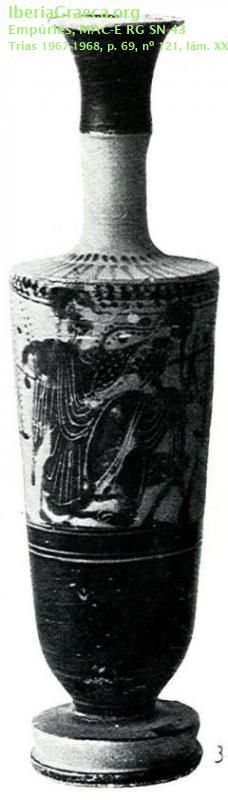 Uso secundario : Ajuar funerario Observaciones : Reconstruido y restaurado en el cuello. El ajuar de esta tumba estaba formado por cinco lecitos áticos de figuras negras (CIG 4526, 4530, 4657, 4662 y 4663), un vaso en forma de Kylix de cerámica de barniz negro indeterminada, un vaso de cerámica con pintura roja de tipo "jónio", un aribalo, una anforita y un alabastron de pasta de vidrio, dos tortugas y un jabalí de terracota, una cadena de bronce, una cuenta de collar de pasta de vidrio y una concha de molusco. Autor: Pol Carreras (CIG) Supervisor: Xavier Aquilué (CIG) Fecha: 07-12-2013 |