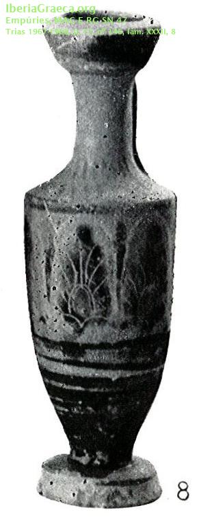 Uso secundario : Ajuar funerario Observaciones : El ajuar de esta tumba estaba formado por cinco lecitos áticos de figuras negras (CIG 174, 198, 241, 816 Y 4533), dos jarritas de cerámica con pintura roja de tipo "jonio", un vaso de cerámica gris emporitana, una anforita de pasta de vidrio, una fíbula de bronce y un anillo de plata. Autor: Pol Carreras (CIG) Supervisor: Xavier Aquilué (CIG) Fecha: 07-12-2013 |