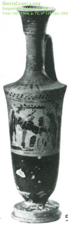 Uso secundario : Ajuar funerario Observaciones : Según BEAZLEY ARCHIVE una de las ménades representadas toca la flauta o aulós pero en realidad toca la lira como dice Trias. El ajuar de esta tumba estaba formado por seis lecitos áticos de figuras negras (CIG 4538, 4659, 4661, 4664, 4665 y 4666), una kylix y un jarrito de cerámica de pasta clara de tipo "jonio-focense", un anillo, un aro y tres brazaletes de plata, un anillo de bronce y un trozo de coral. Autor: Pol Carreras (CIG) Supervisor: Xavier Aquilué (CIG) Fecha: 29-01-2014 |