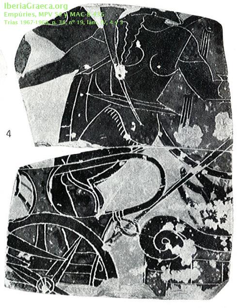 Observaciones : Según escribe TRIAS 1967-68, para Shefton, seguramente esta escena representa a Pelops, hijo de Tántalo y a Oenomaos, rey de Elis. La escena está compuesta por dos fragmentos de una misma pieza: uno, el fragmento superior, está conservado en el Museu de Prehistoria de València y corresponde a esta ficha, y el otro, el inferior, se encuentra en el MAC-Barcelona, número de inventario 435 (Ficha CIG 4919). Autor: Pol Carreras (CIG) Supervisor: Xavier Aquilué (CIG) Fecha: 20-02-2014 |