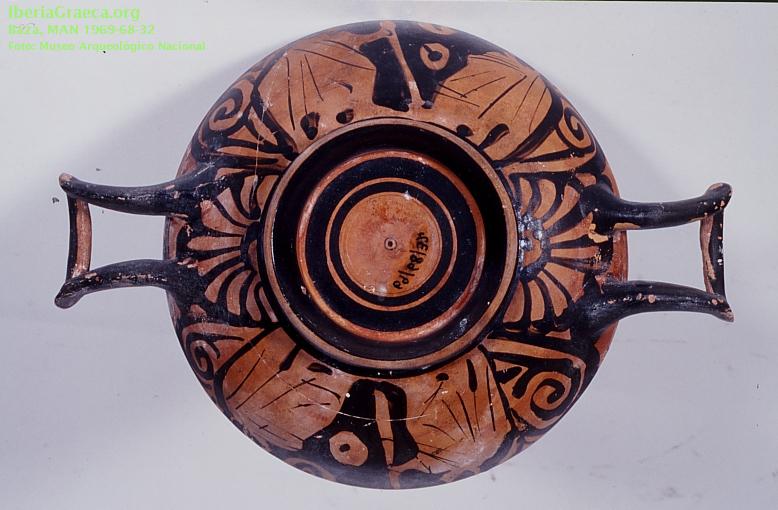 Origen : Ática Técnica : C. de figuras rojas Forma : Copa Parte Conservada : Perfil completo Autor/Taller : VIENNA 116 group DECORACIÓN