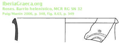 Observaciones : Producción del taller de Roses. Tipo número 67 de la clasificación establecida por Puig/Martín 2006. El ejemplar esta descontextualizado, procede de los estratos tardoromanos de amortización del barrio helenístico. Autor: Pol Carreras (CIG) Supervisor: Xavier Aquilué (CIG) Fecha: 18-04-2014 |