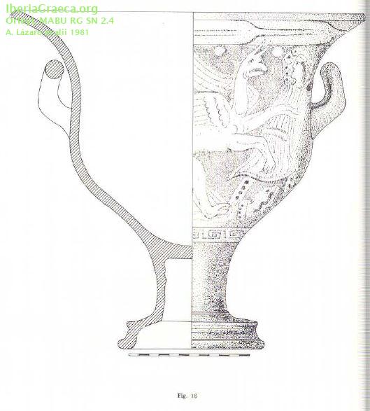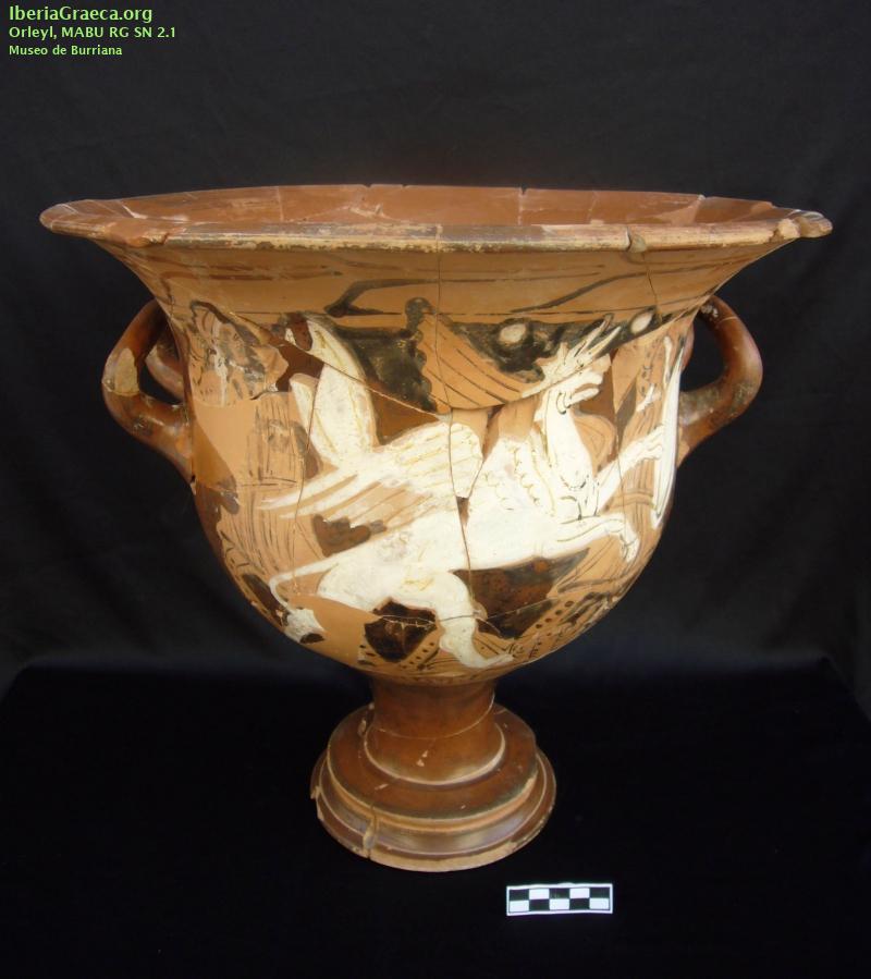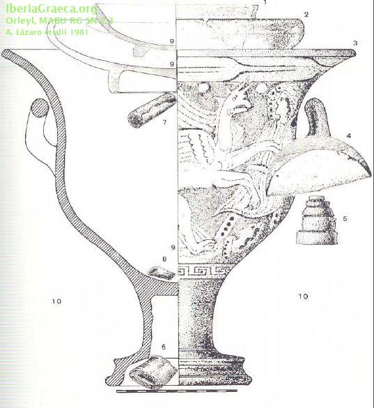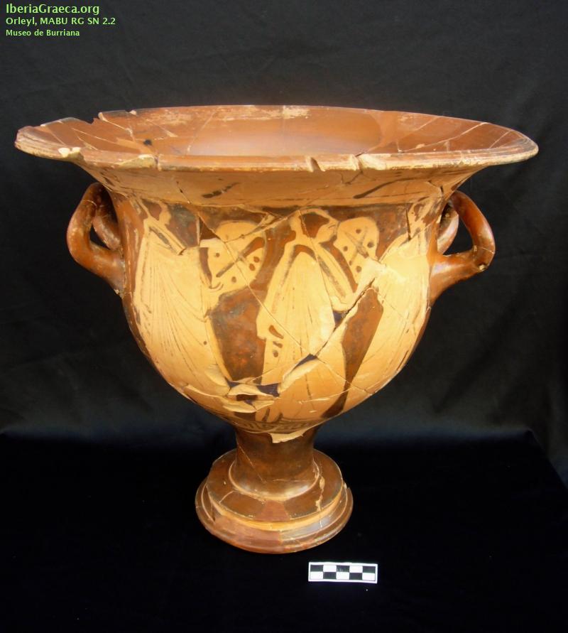 Uso secundario : Ajuar funerario Observaciones : Junto a esta crátera y dos copas áticas apareció en esta sepultura 5 ponderales, 1 plato de balanza de bronce, restos de una falcata y una fíbula hierro y 3 inscripciones ibéricas sobre plomo. Autor: Andrea Zamarro (Museo Arqueológico de Burriana) Supervisor: José Manuel Melchor (Museo Arqueológico de Burriana) Fecha: 14-11-2014 |