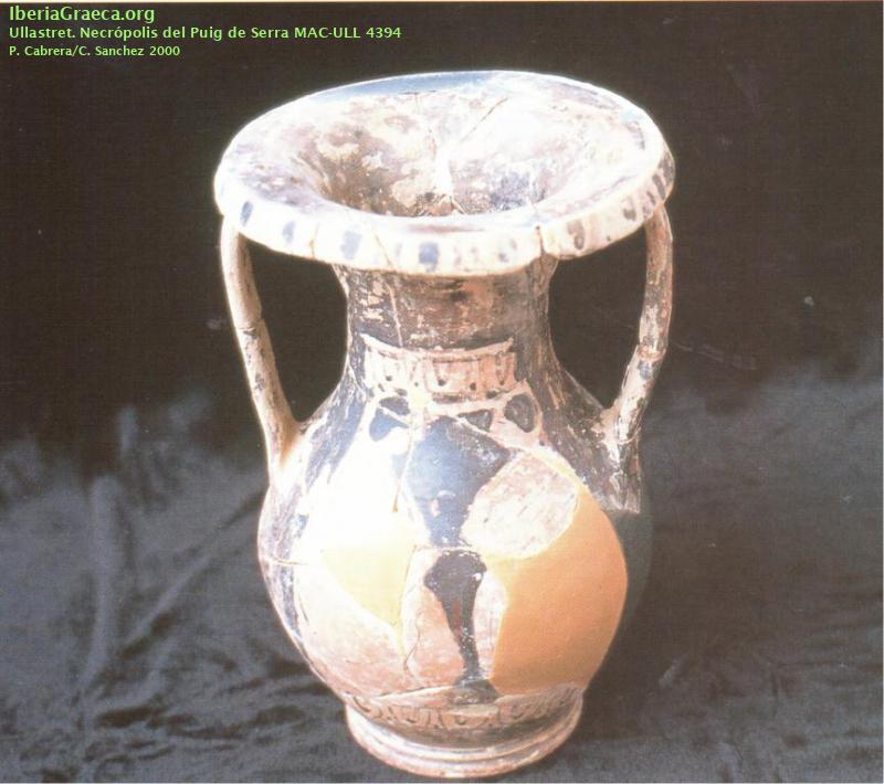 Uso secundario : Vaso cinerario, Ajuar funerario Observaciones : Reconstruida y restaurada. Además de esta pieza, que contenía las cenizas, el ajuar estaba formado por 19 piezas cerámicas (1 guttus (CIG 5577), 1 plato de pescado (CIG 5578), 2 cuencos de cerámica ática (CIG 5579 Y 5580), 1 bol de barniz rojo determinado, 3 pateras y 5 vasos bicónicos de gris emporitana, 2 ánforas de pintura blanca, 1 vaso vertedor y 3 vasos bicónicos a mano), 6 fusayolas de cerámica, 1 disco de cerámica, 1 hebilla y 1 fíbula de bronce y 1 disco de hueso (MARTÍN 2008). Autor: Sara Martínez (CIG) Supervisor: Xavier Aquilué (CIG) Fecha: 19-06-2015 |