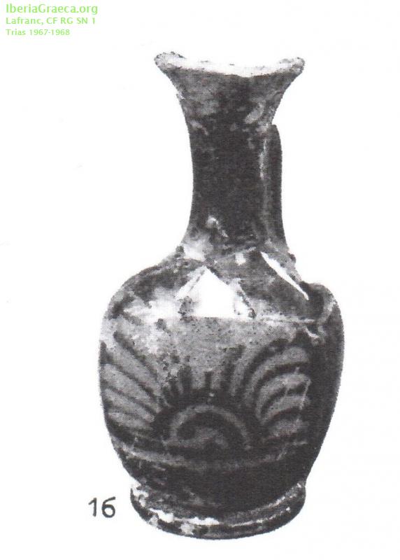 Observaciones : Restaurado en parte de la boca y cuerpo. Esta pieza se encontró en la casa propiedad del Sr. Fina, a unos 100 m de la misma y al lado de la riera, junto con objectos helenísticos y romanos. Autor: Pol Carreras (CIG) Supervisor: Xavier Aquilué (CIG) Fecha: 23-11-2015 |