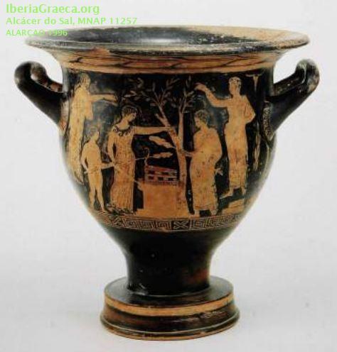 | Tipo Decoración : Barnizada, Pintada Escena : Sacrificio, Dionisíaca Personajes : Figura humana desnuda, Hombre con barba, Ménade, Niño, Joven, Sacerdotisa, Sátiro Elementos Secundarios : Tirso, Planta, Altar, Hoguera, Cola, Olivo, Columna, Himation, Túnica, Pandero, Asador, Templo, Aletas, Vísceras, Cráneo de bovino, Gradas, Tímpano Motivos Ornamentales : Greca de meandros y cruz de San Andrés, Guirnalda de hojas, Palmeta vertical, Rama de laurel, Volutas