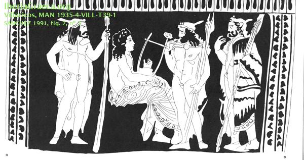| Tipo Decoración : Pintada Escena : Orfeo y los Tracios, Palestra Personajes : Orfeo, Tracio, Joven Animales : Jabalí, Perro Elementos Secundarios : Lira, Plectro, Manto, Lanza, Corona, Gorro frigio, Himation Motivos Ornamentales : Hoja de hiedra, Lengüeta, Línea, Punto, Cadena de capullos de loto