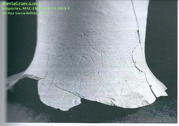Observaciones : Según DE HOZ GARCÍA BELLIDO 2014, la primer grafito Y seria una marca de comerciante. El segundo, formado por un letras ibéricas como posible marca y un numeral griego (38) y el tercero un numeral griego (190), hechos por dos personas diferentes. Interpretación incierta. Autor: Pol Carreras (CIG) Supervisor: Xavier Aquilué (CIG) Fecha: 28-12-2015 |