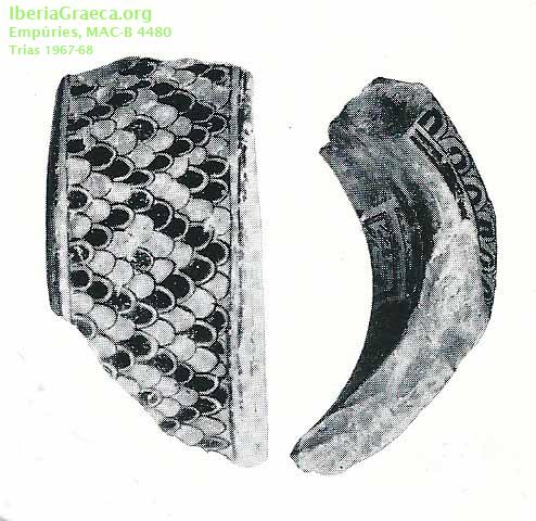 Observaciones : Según TRIAS 1967-68, este fragmento puede pertenecer a un caballete o conchera laconia de un tejado, o puede pertenecer tambien al labio de un enocoe ático o a un soporte anular del vaso. Excavación 10 de enero de 1926. Autor: Sara Martínez (CIG) Supervisor: Xavier Aquilué (CIG) Fecha: 06-04-2016 |