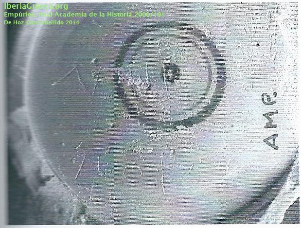 Observaciones : El fragmento procede de las excavaciones efectuadas para la construcción de una cisterna en la década de los años 50 del siglo XX debajo de la terraza que cierra el Museo por el norte (iglesia del convento de los Servitas). Fue depositada junto con otros materiales como colección de prácticas por M. Almagro en el Departamento de Prehistoria de la Universidad Complutense de Madrid. Actualmente esta pieza se halla en el Gabinete de Antigüedades de la Real Academia de la Historia, núm. de inventario 2000/101, según DE HOZ GARCÍA-BELLIDO 2014. El grafito es una indicación comercial que serviría para identificar un lote de 18 vasos decorados. Autor: Sara Martínez (CIG) Supervisor: Xavier Aquilué (CIG) Fecha: 21-04-2016 |
