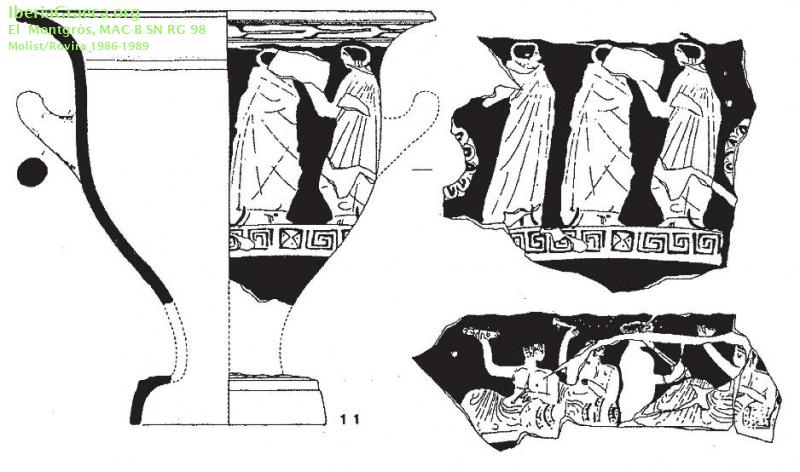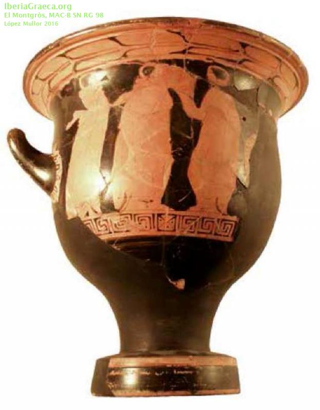 Origen : Ática Técnica : C. de figuras rojas Forma : Cratera de campana Parte Conservada : Perfil completo DECORACIÓN