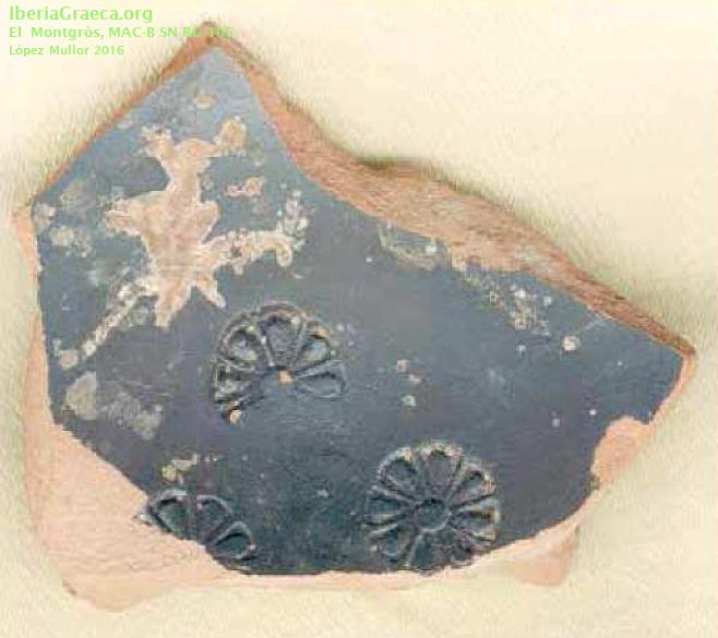 Origen : Rhode Técnica : C. de barniz negro Forma : Cuenco Tipo : Roses 11 Parte Conservada : Fondo DECORACIÓN